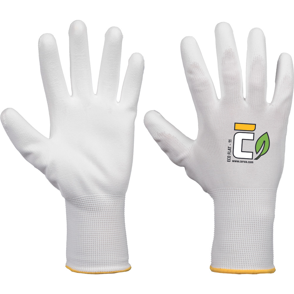 Környezetbarát, varratmentes újrahasznosított fehér poliészter fonalból készült munkavédelmi kesztyű. Légáteresztő és könnyű viseletet biztosít. A tenyérrészt vízbázisú, fehér poliuretánnal (PU) mártották be, ami jobb fogást és tartósságot nyújt anélkül, hogy csökkentené a rugalmasságot. Különösen alkalmas precíziós munkákhoz, ez a kesztyű ötvözi a teljesítményt és a környezeti felelősségvállalást.