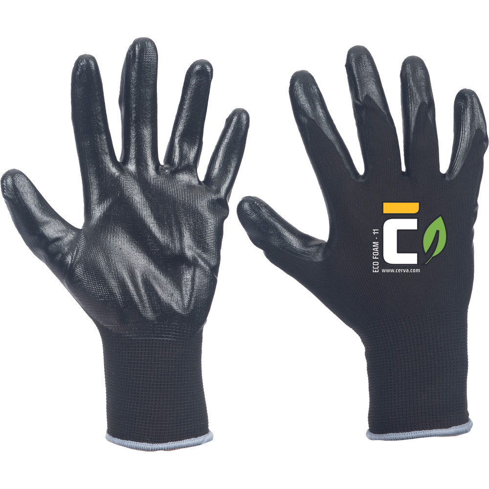 Fekete, környezetbarát, varratmentes munkavédelmi kesztyű újrahasznosított poliészter fonalból készül, amely kényelmes viseletet biztosít egész napra. A tenyérrészt habosított nitrilbevonat fedi, amely kiváló fogást és rugalmasságot nyújt, különösen nedves és olajos ipari környezetben végzett precíziós munkák során. Megbízható, környezettudatos megoldás megterhelő munkakörülményekhez.