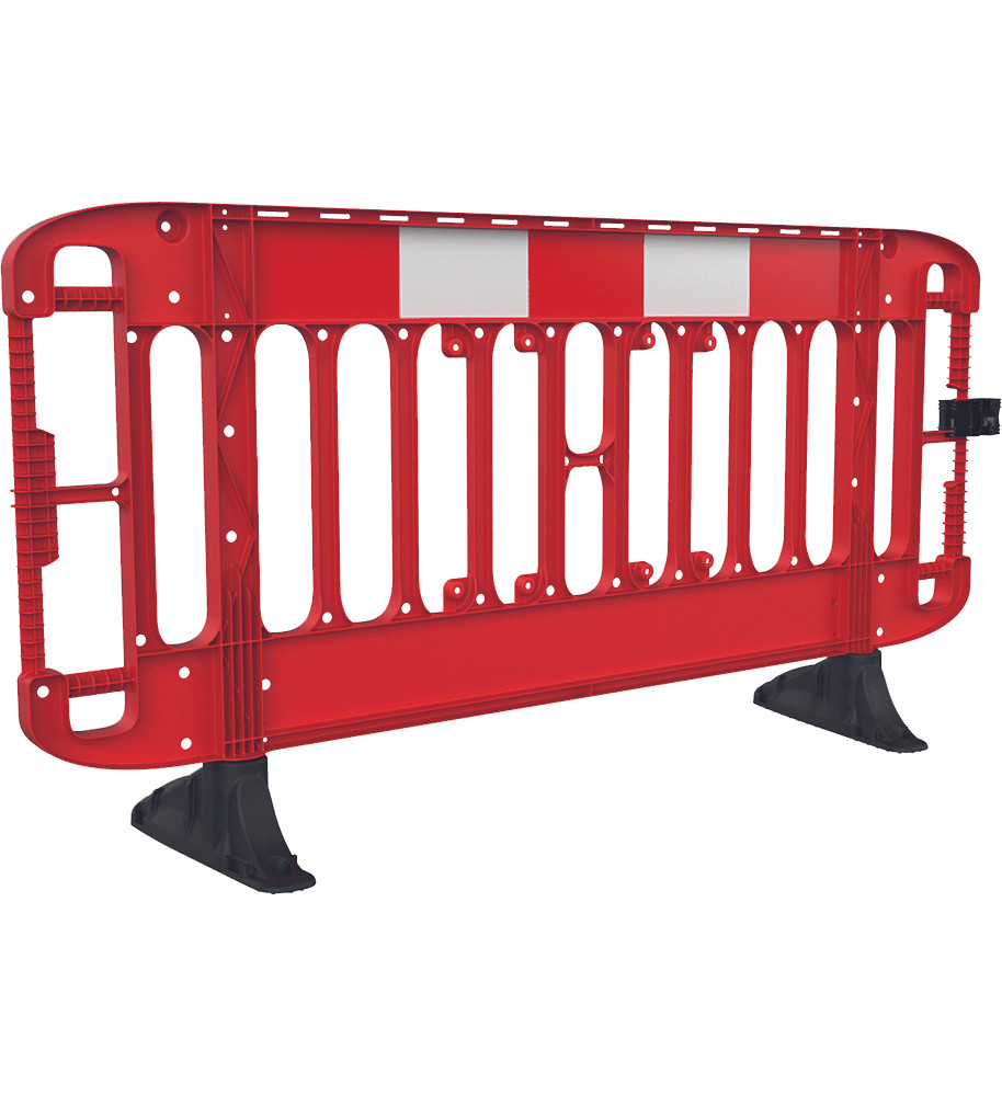 »Kapcsolható és rakásolható útkorlát elem; prémium minőségű PP alapanyag, fémmentes és újrafelhasználható; fagypont alatti hőmérsékleten is megőrzi szilárdságát, 2 év színtartósság; fényvisszavető panel R1: EN12899-2, 20% -kal több fényt vet vissza, mint a standard alacsonyabb minőségű fényvisszaverő anyagok; asszimetrikus, botlásveszélyt csökkentő talpak; rugalmas csatoló elem, amely alkalmas más típusú elemekhez is - a kapocs merev összekötést is képes biztosítani - egyenetlen talajon is használható, például járdán, vagy durva terepen; intelligens reteszelő maximalizálja a tárolási és szállítási stabilitást, biztonságosan rakásolható; teleszkópos támasz is rendelhető.