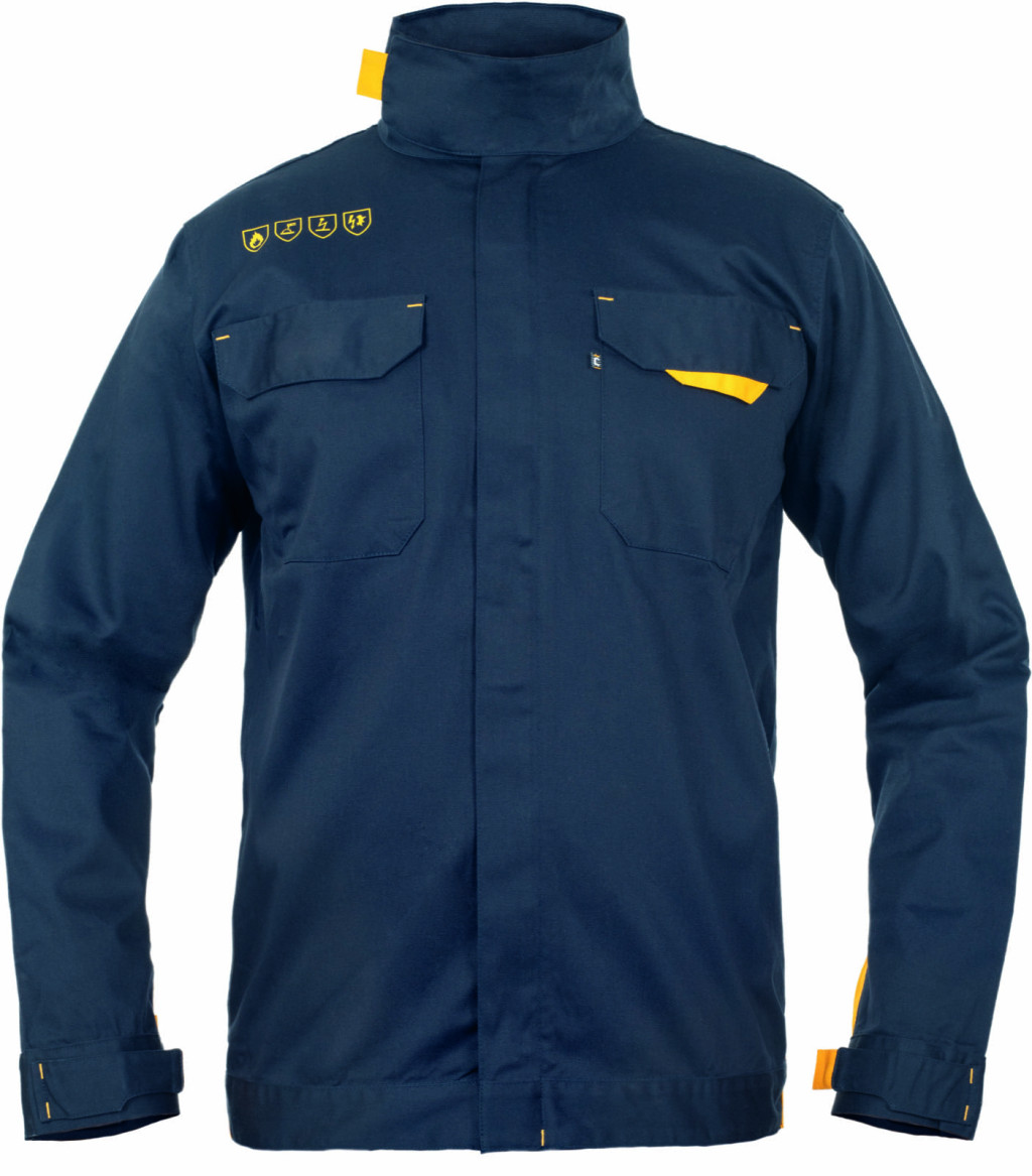 Multinorm munkakabát cipzárral záródó kivitelben, tépőzáras hajtókával. Állógalléros kialakítás, 2 hajtókás mellzsebbel, tépőzárral állítható mandzsettával.