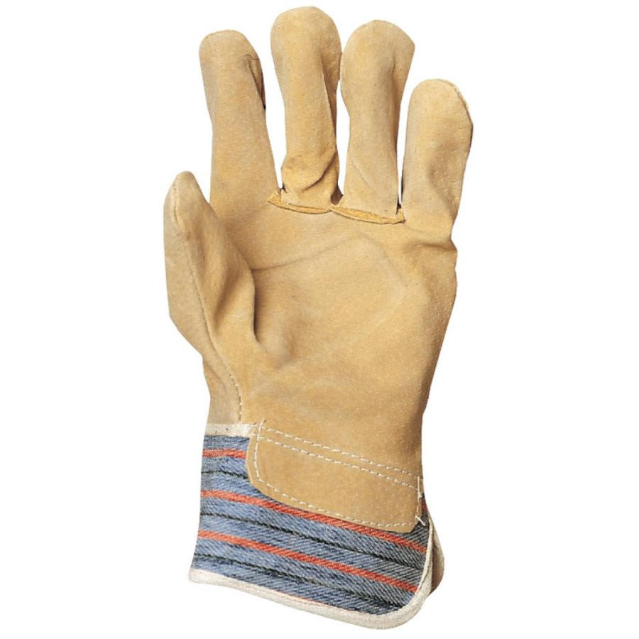 Erős, kopásálló rugalmasan kézre simuló védőkesztyű, kötött, 10-es alap, poliamid külső, pamut belső, vastag, puha, rávarrt marhahasíték tenyér és ujjak, gumírozott mandzsetta