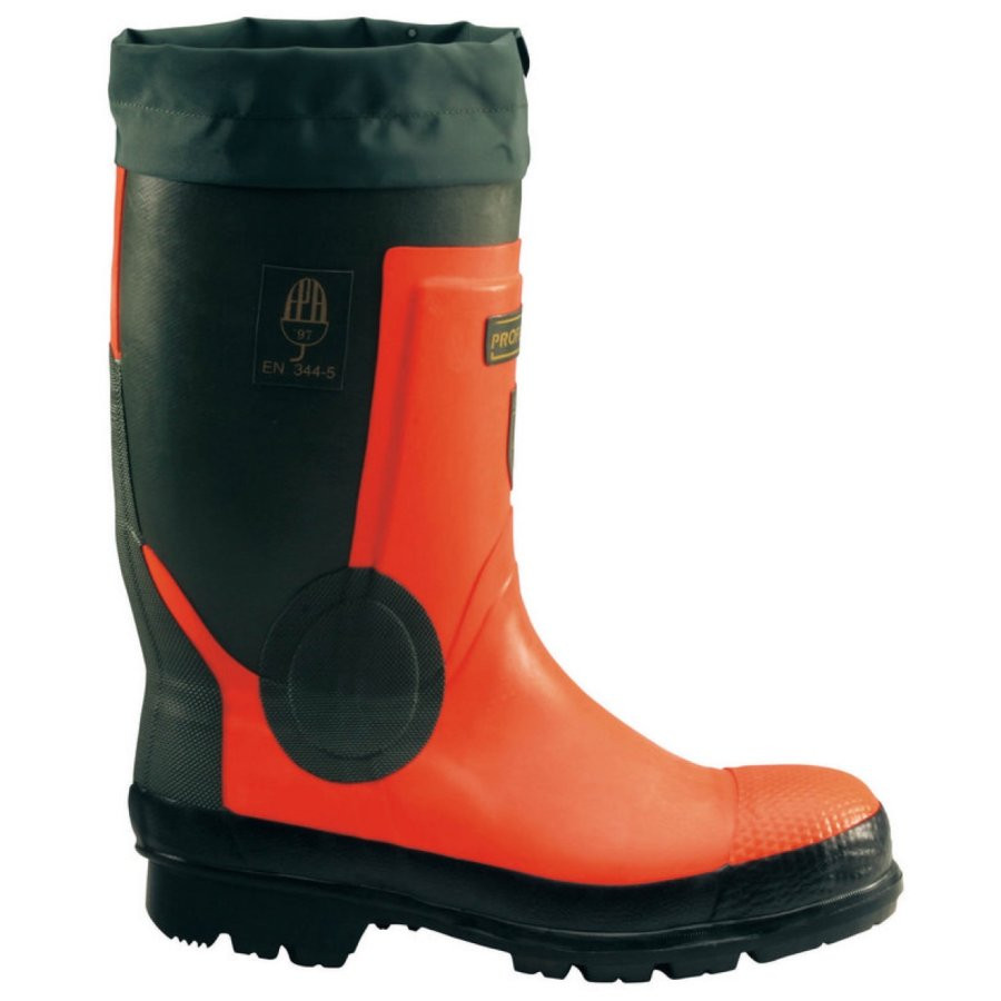 Vulkanizált természetes kaucsuk alapanyag, pamut textil béléssel, jól látható narancs színű, vízálló felsőrész, sima és csúszós felületű ipari padozaton és szabadtéri használatnál is csúszásbiztos, olaj-, és saválló nitril gumitalp, acél lábujjvédő leeső tárgyak ellen, átszúrásmentes talp, boka- és sarokerősítés, 40 cm-es szármagasság, 3-as vágásvédelmi osztályú védőcsizma 28m/s láncsebességű láncfűrész használatához, csizmabéléssel téliesíthető, folyamatosan ellenőrzött alapanyag ésminősített gyártási folyamat, a német KWF szervezet által tanúsított KWF PROFI minősítéssel