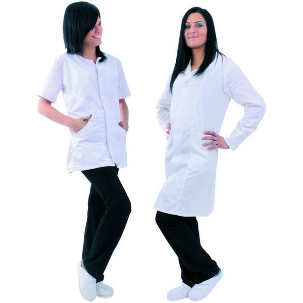 245 g/m2 vastag, lánckötésű, 65% poliészter, 35% pamut alapanyag, karcsúsított fazon, két oldalzseb, rövid ujjú, gallér nélküli, cipzáras, jól szellőző köpeny, tartós vászonból, szín: fehér