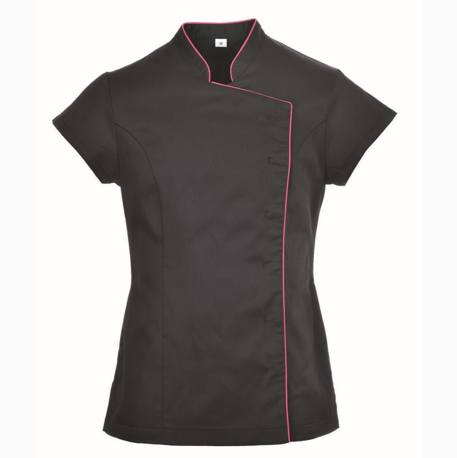 Stílusos tunika modell nagyméretű oldalzsebekkel, rejtett patentos záródással, kényelmes szabással és kontraszt csíkozással.